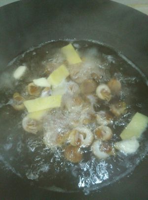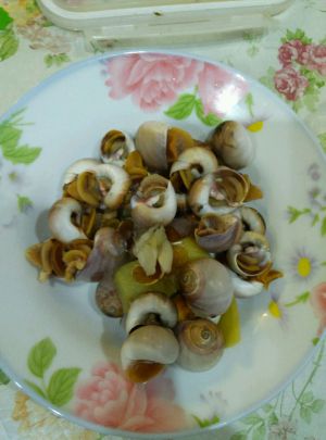 冷水放入黄酒,姜片,蒜头。烧开后,放入洗净的香螺。大火烧开,至香螺全部张口,盛起沥干装盘。