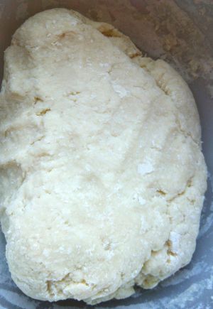 在麦心粉堆中间挖一个洞,逐次加入开水,用筷子由雪花状逐渐拌成块,稍凉后揉成团,盖上保鲜膜饧面20分钟左右,备用