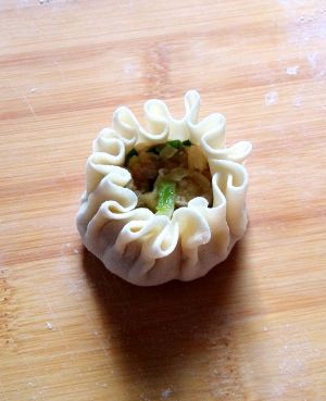 右手像包包子一样,用拇指在中间压住馅料,食指在“烧麦皮颈部”边转边捏褶,无名指在底下托着点儿已经捏好的褶皱,直到整个完成