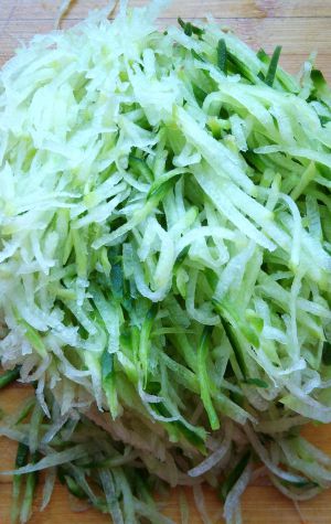 萝卜洗净,擦丝,开水焯一下,挤出水分后撒少许盐,腌制片刻后挤出水分