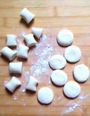 将饧好的面团揉匀,揉成长条,切成大小相当的剂子,压成薄饼