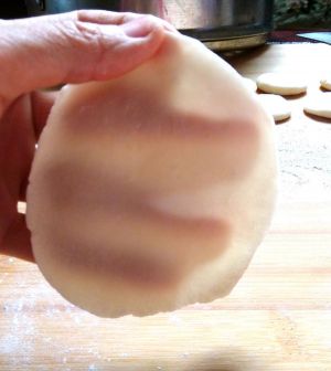 把薄饼摞在一起,中间洒些干面粉,用擀面杖擀成薄片,越薄越好。如果家里有啤酒瓶,用瓶肩的部分擀边缘,更容易擀出荷叶边,包出来的花瓣更繁复