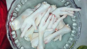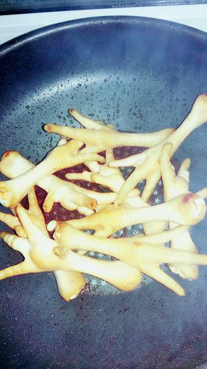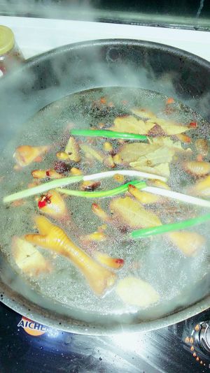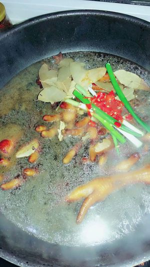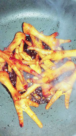 锅里加水,没过鸡爪,再放适量料酒和盐