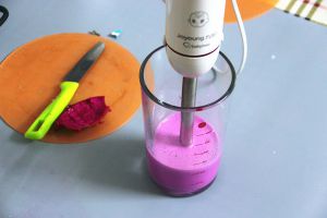粉色层(表层):红色火龙果肉加牛奶用料理棒打成果汁,取200毫升备用。