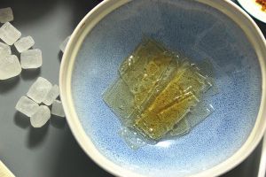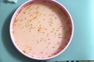 原色层(底层):煮好的糖水中加入备用的吉利丁片,搅拌溶化后与浸泡好的桂花混合,稍微不烫手时倒入模具,盖好放冰箱冷藏1~2个小时至凝固。