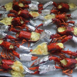 1.将刷好酱料的虾放入预热过的烤箱里,中层上下火烤至虾肉出汁。给小龙虾刷第二次酱料,进烤箱。