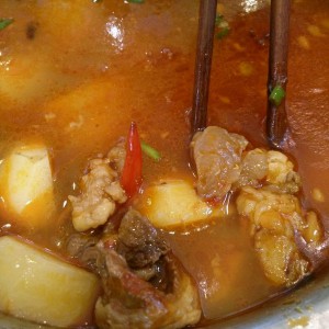 最好是用混合油 我用的是牛油和调和油 等油热了以后 就把所有的备好材料一起倒下锅 注意哦 泡椒会溅油的