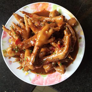 继续翻炒,炒两分钟,放入辣椒红油,炒均匀,放点酱油,到点开水,盖锅盖,闷五分钟,出锅前倒蚝油,盛起时,撒点葱在把锅里剩余的汁浇到鸡爪上就好了