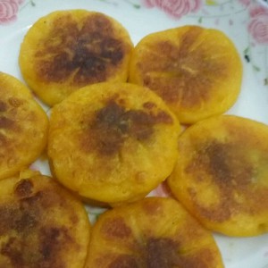 小麦淀粉要拿开水烫,边加水边搅烫成水晶状。大概500g南瓜放200g小麦淀粉就行。