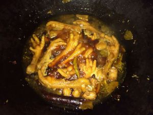 然后捞起过冷水,晾干,锅小火烧热倒油姜,蒜,鸡爪,卤料,生抽,料酒,蚝油及半块黄糖放进去,加水没过鸡爪就可以。