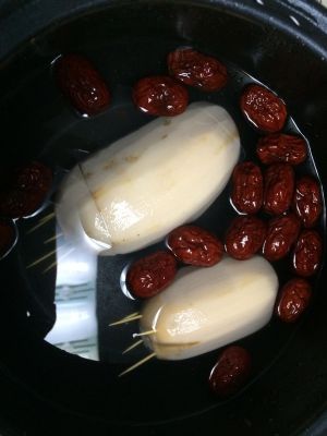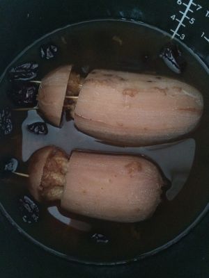 用牙签封口,同红枣、清水入电饭煲内,选择蒸煮功能煮30分钟。