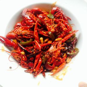 橄榄油下锅加热把花生干辣椒大火炒香,加入龙虾翻炒两分钟,关小火加入烧烤酱混合香料继续加热五分钟,临关火加入墨西哥辣椒混合半分钟关火
