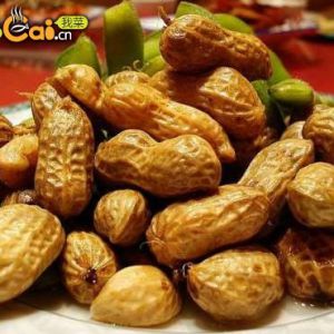 锅内加水,下花生果、精盐、生姜、八角、三柰、花椒煮1个小时;浸泡半天后取出花生果装盘上桌。