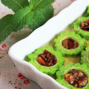 苦瓜洗净,切成段,挖去瓤,在冰水中浸泡