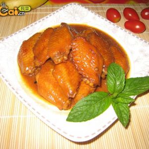 锅中放入少许油,一小勺白糖。炒糖变色起泡迅速放入翅中翻炒上色,填入配料炒出香 味,加入料酒、生抽。