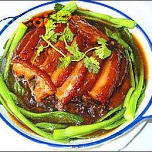 梅菜芯洗净浸二十分钟,冲净挤干水分,切碎,以中火稍炒片刻,放在排好的腩肉上,淋入汁料,再放上姜、葱、隔水蒸1.5个小时,取出姜、 葱扣于碟上即可上桌。