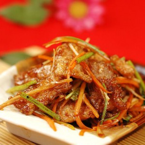 香菜,大葱,胡萝卜切丝。猪里脊肉切厚片,加少许料酒,盐,胡椒粉腌制入味。