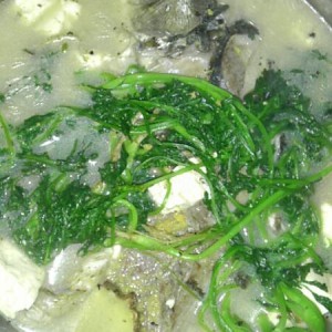 最后加入1公升左右清水和豆腐大火煮开,慢火再煮5分钟,此时加入香菜和稍煮片刻加入盐和鸡粉,就这样大功告成了