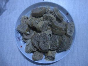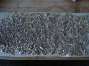 将拌好的肉馅均匀抹在干豆腐上,从一头卷起,卷紧一点,卷到最后,在干豆腐的边缘抹上蛋黄,卷上!