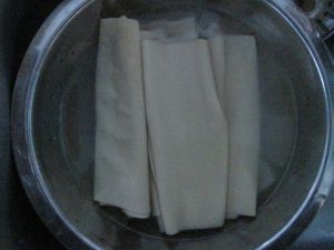 干豆腐买回后,用开水烫一下,再放凉水里冷却!