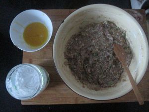 将肉馅用水朝一个方向拌,然后放入盐、味精、十三香、葱花、蒜末、100克淀粉、鸡蛋清,将馅搅均,留下鸡蛋黄封口!