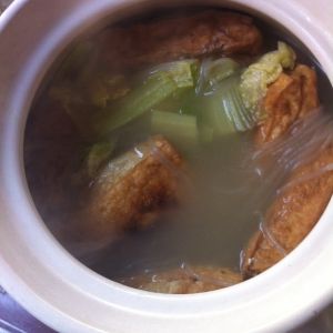 用砂锅加入高汤,或清水,放入豆腐、白菜、粉丝,一起煮熟即可