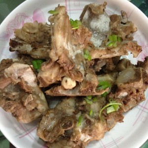 羊蝎子先在清水中浸泡、清洗、然后放入凉水锅中同步放入一个辣椒,少许花椒和孜然!