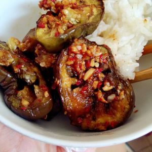 自制调料:大蒜末,生姜末,豆豉鱼油,耗油,辣椒面,盐,五香粉,孜然粉,一点点植物油,以上调料一起拌匀,然后等茄子烤大约七八分钟拿出来,两面都刷上自制调料。再放入烤箱烤大约五分钟就可以了。取出来撒上葱末或者香菜,比外面的烤茄子好吃多了,主要自己做的很卫生。配米饭太美味,食欲大开。