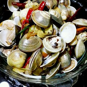 锅里倒油 爆香葱姜蒜辣椒 倒入花蛤 加老抽 盐 爆炒 最后倒白酒 炒一会加糖