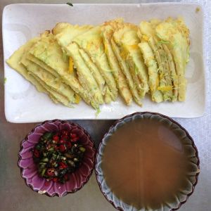 锅里加入少许油,适量面糊倒入锅里,用菜铲摊成圆形