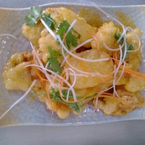 2.炒锅置火上,放入色拉油烧至六七成热,先将码好味的肉片与稠糊拌匀,再一片片展开,逐一下入锅中,炸至外酥内嫩时捞出沥油。