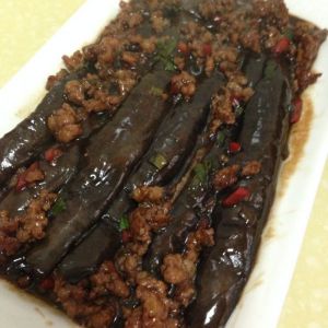 锅里放少许油把肉末也炒熟,中间淋点料酒去腥,加入甜酱,摆入茄子,加点水,让茄子吸收酱汁。