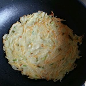 起锅,热油,取适量面糊摊开,待烙至两面金黄后出锅。