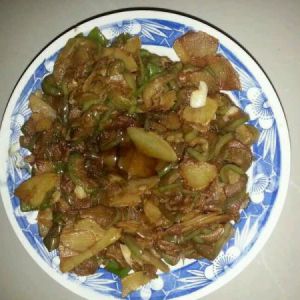 倒入少许油把葱姜青椒倒入翻炒下,再倒入土豆和茄子翻炒,加入盐糖,酱油翻炒下即可出锅!