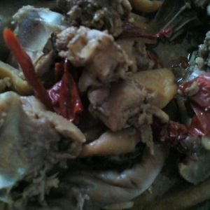 在高压锅里放入姜蒜,辣椒,萝卜干和鸭子,入料酒。蒸熟,即可
