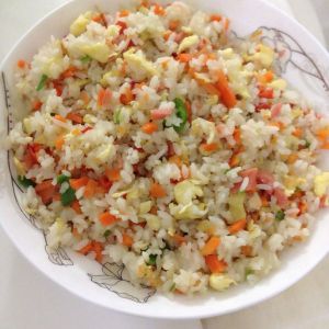 炒出鸡蛋香味放米饭,把米饭炒到没有饭团