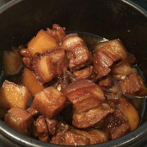 煮开之后转小火,慢炖,注意要去翻锅,要不然肉有可能黏住锅底,我这个时候放了五六块冰糖。注意,砂锅小的话可能会益出,我至今没找到什么好方法~