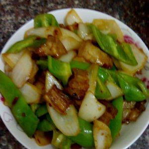 起锅放油加热把肉倒进去、炒到肉有点变色放入豆瓣酱炒出红油、然后把洋葱放进去炒几下再放辣椒下去炒、最后放盐再炒几下起锅装盘