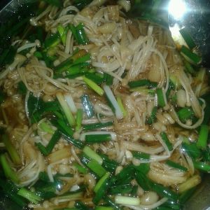 热油,把花生油烧开。淋在葱上。再把之前的酱油和醋混合的那碗下锅热一下,淋在金针菇里。拌匀。