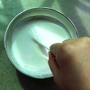 将步骤2充分搅匀 静置20分钟后 凝固成半固体状的酸奶油后 包上保鲜膜 放入冰箱冷藏