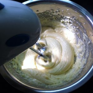 这时趁热加入25g切小的黄油 用打蛋器最低速 不然就用手动打蛋器好了 搅至无颗粒的浆状