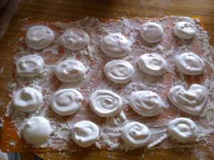 分成两份,白色的放入裱花袋中,挤成小圆饼在硅胶垫上,哎我挤得不太好