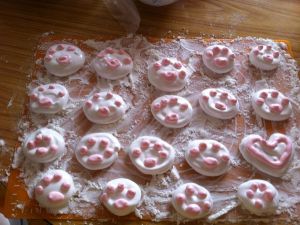 将粉色的糊糊也放入裱花袋中,挤出小猫爪即可