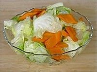 卷心菜撕片,胡萝卜去皮切片,将卷心菜和胡萝卜用盐拌匀,腌制1小时左右,至菜叶出水变软。用手将菜叶挤干。