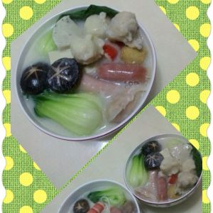 第六步 把焯好的香菇海鲜鱼丸还有油菜摆在面条的碗里 四个小时的汤汤用上啦 倒在面条碗里 就OK啦