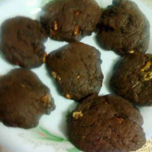 冷却后加入蛋液搅拌,加入过筛的粉料用橡皮刮刀翻拌均匀。再加上巧克力碎和坚果碎翻拌