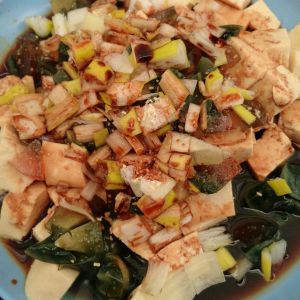把葱,皮蛋切丁放豆腐上面少撒点盐,味素(为了健康可不放)酱油