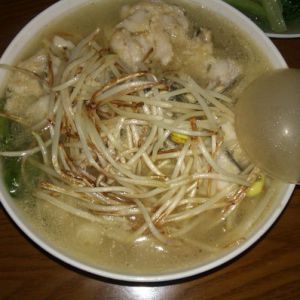 热锅底油,放入姜蒜爆香,放入鱼骨炒5分钟加入清水,水滚后,捞出鱼骨,调味鱼汤。将鱼汤倒入铺好生菜的碗里。