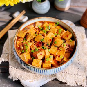 先来处理一下豆腐,卤水豆腐切成大约1.5厘米见方的小方块,锅中加入稍多清水,都凉水下锅,开锅后转小火焯烫两分钟捞出备用,豆腐经过这样处理可以去除豆腥味儿,也能防止炒碎