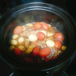 鹌鹑蛋进锅炖个十分钟,再加入小西红柿接着用小火慢慢炖,让西红柿的味道进入肉和鹌鹑蛋中。